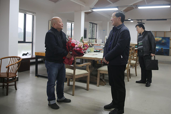 胡代松代表省委宣傳部對段江華及廣大師生致以新春的問候與祝福。他高度贊揚了段江華曾英勇救下落水女童的壯舉,關切詢問了后湖藝術園近年來的建設發展成果,并希望大家能夠充分利用藝術園區齊全的硬件設施和良好的文化氛圍,創造出讓人民滿意的優秀畫作,為湖南藝術事業的發展作出更多貢獻。