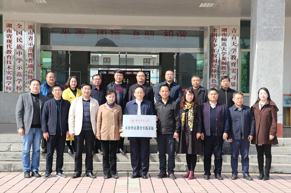 省外語基礎教育研究中心、花垣縣人民政府、花垣縣教體局、邊城高級中學及我校外國語學院相關負責人參加授牌儀式。