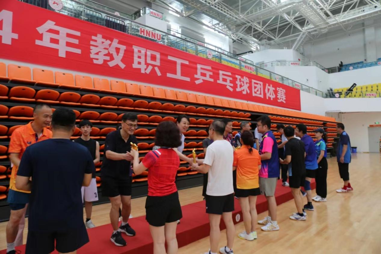蔣洪新參加教職工乒乓球團體賽,為獲獎隊伍頒獎,宣布2024年我校教職工乒乓球團體賽圓滿落幕。