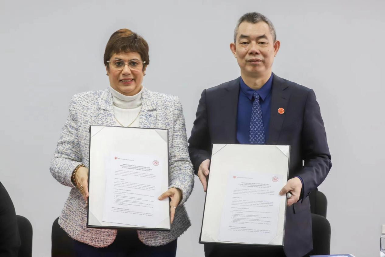 在秘魯塞薩爾瓦列霍大學訪問期間,該校校長珍妮特坦塔麗以及首席執行官凱莉阿庫娜熱情接待了訪問團一行。蔣新苗簡要介紹了我校辦學歷史,并回顧了兩校合作交流歷史,重點介紹了我校法學以及外國語言文學等專業的發展情況,希望以此次訪問為契機,推動雙方在法學、西班牙語、拉丁美洲文化研究等領域的交流與合作。雙方就聯合科研、師生交換、合辦中文教學中心等議題進行了深入交流,并簽署了合作備忘錄。