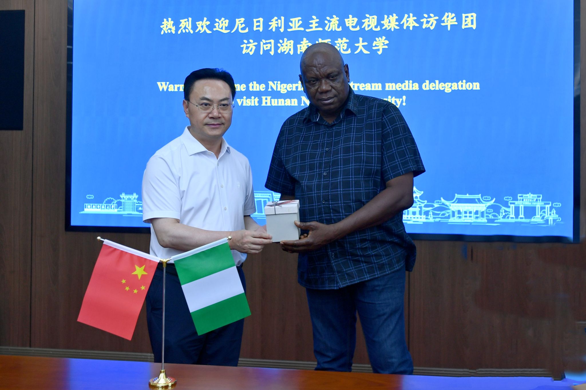 劉仲華代表學校對代表團一行的到來表示熱烈歡迎,并簡要介紹了我校國際交流與合作情況。他表示,中非文化交流的歷史源遠流長,“一帶一路”倡議賡續中非情誼,中非經貿博覽會等盛會也進一步深化了雙方的合作。我校一直以來高度重視國際交流與合作,目前與6所非洲大學和機構建立了合作關系。他表示,此次查爾斯先生率團來訪,對于夯實中尼兩國傳統友誼、深化中非高校交流合作具有十分重要的意義。希望尼日利亞媒體朋友能夠真實、全面、客觀地分享關于此次中國之旅的體驗,積極傳播中國形象,讓更多尼日利亞及非洲友人認識中國、了解湖南、走進湖南師范大學,進一步加強我校與尼日利亞高校的學術與人文交流,在人才培養、科學研究等方面爭取更大更新的共贏空間,合力開啟兩國高等教育發展新篇章。
