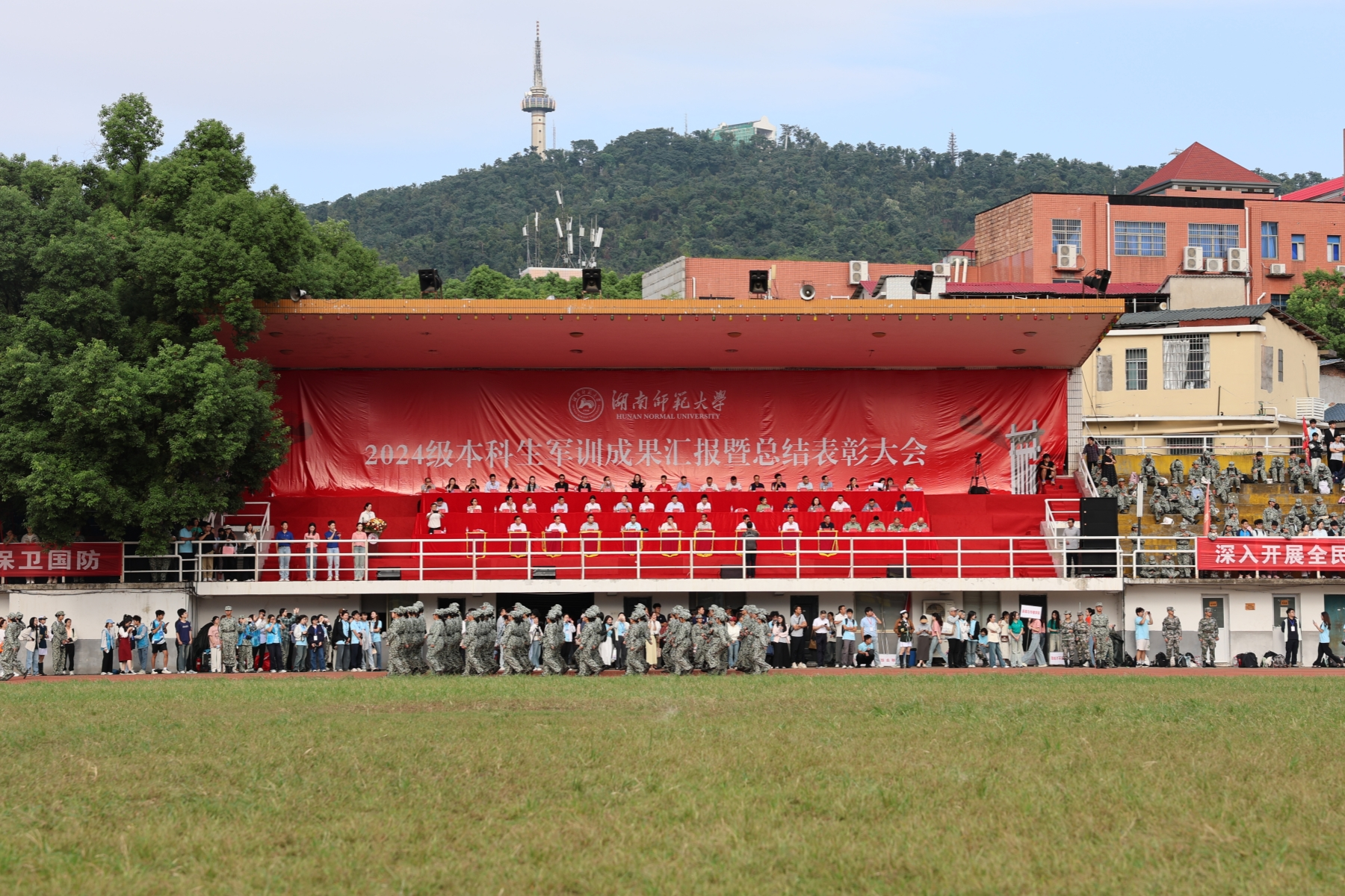 (記者 榮佳怡 張婧茹)9月22日上午,我校2024級本科新生軍訓成果匯報暨總結表彰大會在二里半校區田徑場舉行,來自22個學院的同學們身著軍裝,神采奕奕,接受檢閱。省教育廳領導、岳麓區人民武裝部領導,我校副校長王輝、學校各職能部門負責人、校軍訓工作領導小組成員及各學院負責人一同檢閱了2024級本科新生軍訓成果。大會由學生工作部(處)、武裝部副部長,軍訓團政委彭露主持。