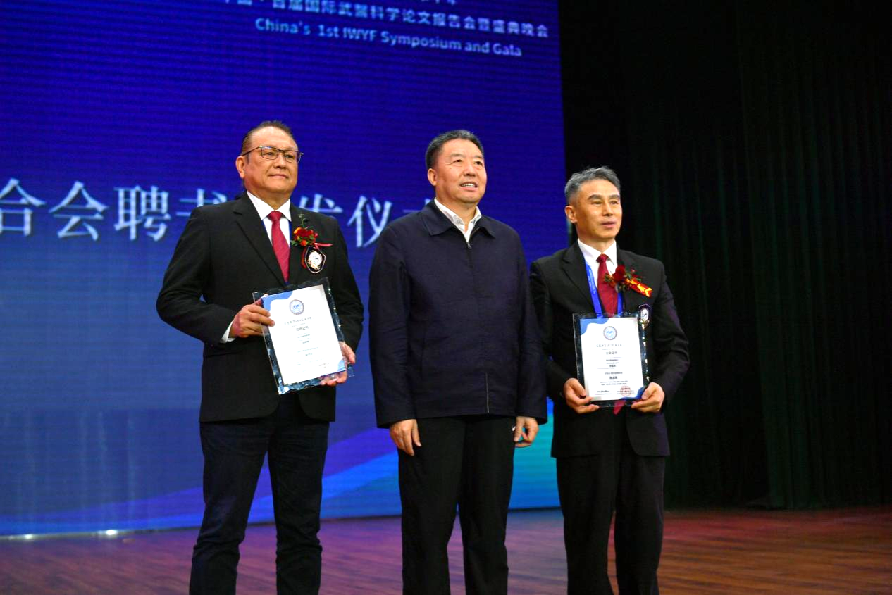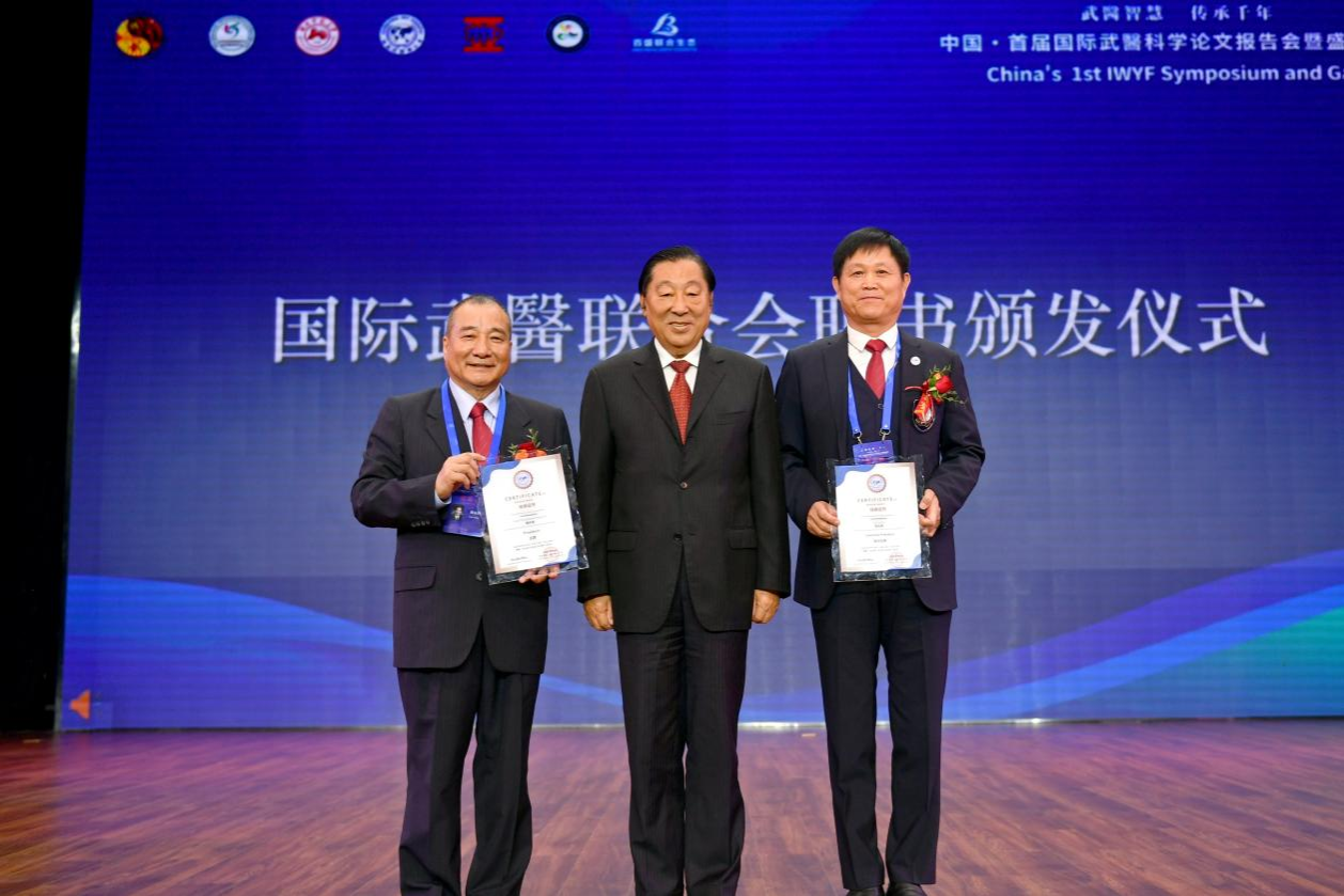 蔣滌非為國際武醫(yī)聯(lián)合會副主席頒發(fā)聘書。陳永杰、蔣洪新為本屆論文報告會一等獎作者頒發(fā)證書。