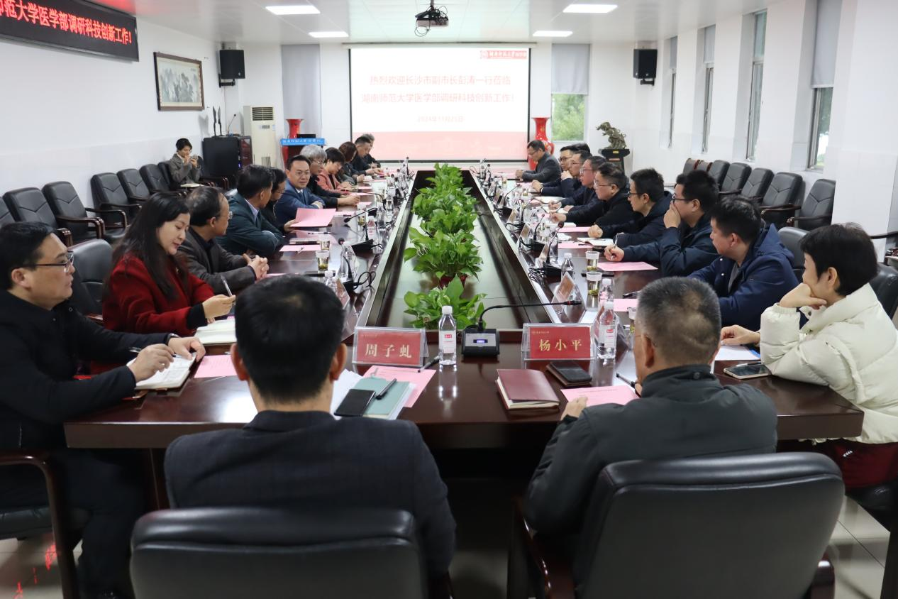 劉仲華對彭濤一行來校調研指導表示熱烈歡迎和誠摯感謝。他介紹了學校的發展歷史與辦學特色,并表示,學校將加快新醫科、新工科布局,積極對接地方經濟發展需求,充分發揮學校智力、人才、科技等優勢,加快科技成果轉化應用,在服務長沙經濟社會發展持續發力,在培育和發展新質生產力中彰顯師大作為。