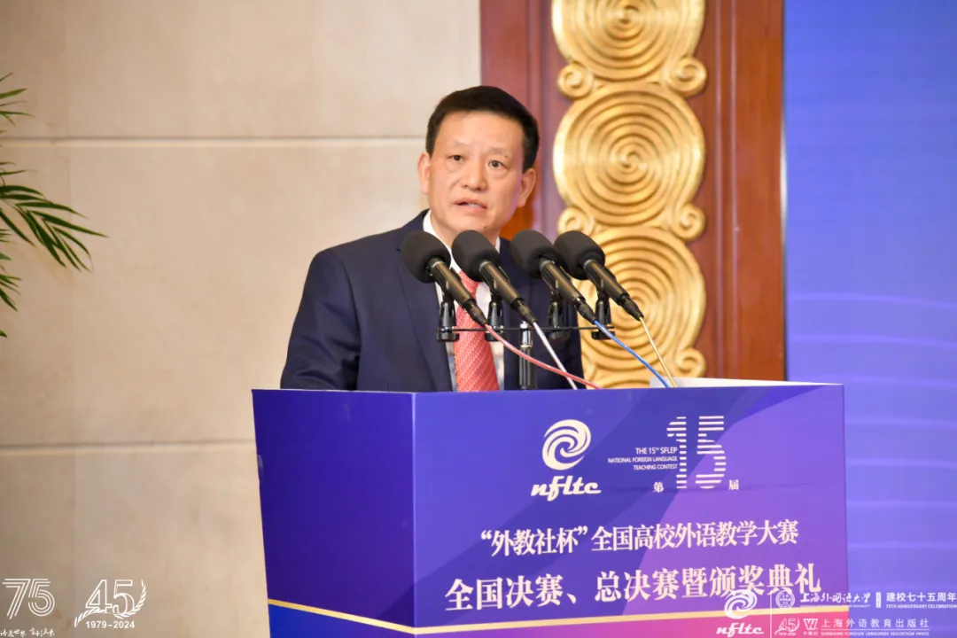 12月8日,第十五屆“外教社杯”全國(guó)高校外語教學(xué)大賽全國(guó)決賽、總決賽頒獎(jiǎng)典禮在上海舉行。蔣洪新為大賽創(chuàng)始人頒發(fā)榮譽(yù)獎(jiǎng),并受邀致辭。他指出,“外教社杯”全國(guó)高校外語教學(xué)大賽作為我國(guó)最早舉辦的大學(xué)外語教學(xué)比賽,也是規(guī)模最大、范圍最廣的比賽之一,是外語界的一項(xiàng)盛事。自第三屆起,增設(shè)了外語類專業(yè)組比賽,不僅為外語教師提供了一個(gè)展示專業(yè)水準(zhǔn)和交流經(jīng)驗(yàn)的平臺(tái),也為外語教學(xué)領(lǐng)域注入了新的活力,讓我們看到了外語教育蓬勃的后生力量。大賽在競(jìng)技、交流的同時(shí),為外語人才的培養(yǎng)和學(xué)科發(fā)展做出了有益的探索:一是不斷激活學(xué)科建設(shè)的內(nèi)驅(qū)力;二是持續(xù)推進(jìn)外語教育教學(xué)改革;三是深入探索新技術(shù)的跨界應(yīng)用。站在嶄新歷史起點(diǎn)上,外語教育事業(yè)的舞臺(tái)空前廣闊,希望大家在服務(wù)國(guó)家重大戰(zhàn)略中,為共同的外語事業(yè)開創(chuàng)更加美好的未來。