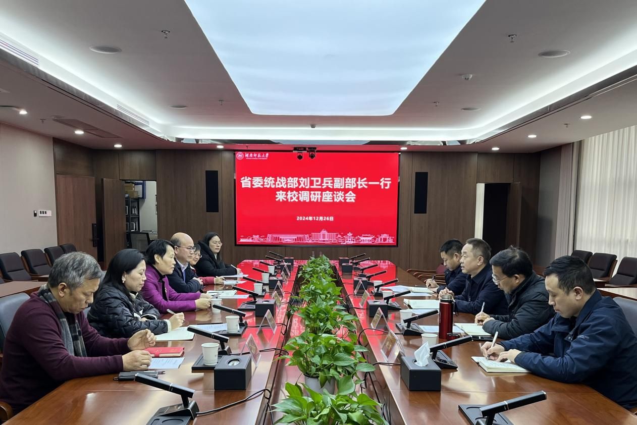 (供稿 黨委統(tǒng)戰(zhàn)部)12月26日下午,省委統(tǒng)戰(zhàn)部副部長劉衛(wèi)兵一行來校調(diào)研。調(diào)研座談會(huì)在三棵樹科研樓四樓會(huì)議室舉行。副校長謝資清出席會(huì)議,會(huì)議由校黨委委員、統(tǒng)戰(zhàn)部部長楊念主持。