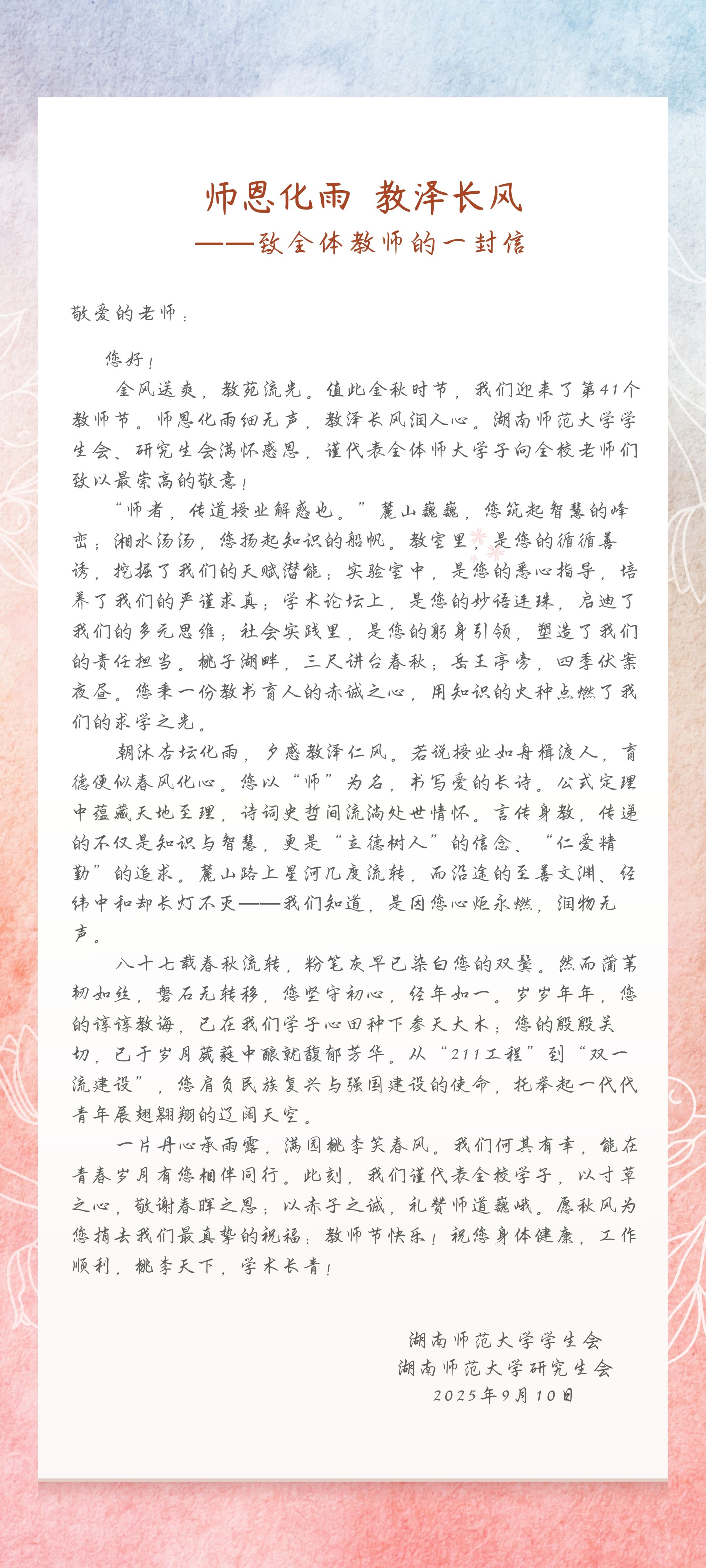 2025-09-10 09:42 來源:湖南師范大學(xué)新聞網(wǎng) 作者:湖南師范大學(xué)學(xué)生會(huì) 湖南師范大學(xué)研究生會(huì) 點(diǎn)擊: