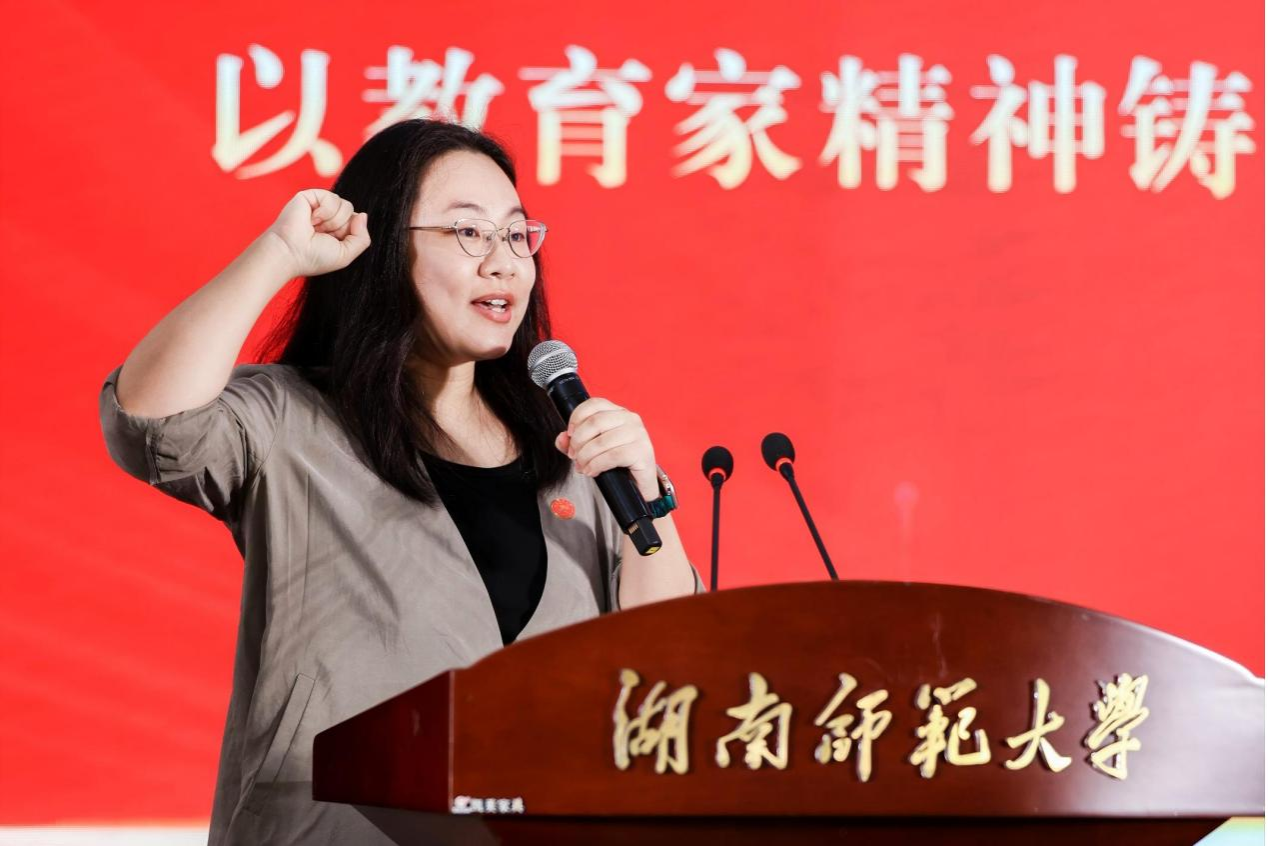 教職工代表、音樂(lè)學(xué)院新進(jìn)教師王藝璇博士發(fā)言。她為能夠加入湖南師范大學(xué)感到驕傲和幸福,并分享了自己的感悟:一是要持續(xù)精進(jìn)學(xué)業(yè),做學(xué)習(xí)的篤行者;二是要矢志修身養(yǎng)德,做學(xué)生的引路人;三是要扎根藝術(shù)實(shí)踐,做時(shí)代的歌唱者。她承諾將以熱忱之心投身教學(xué)科研,以創(chuàng)新之心擁抱時(shí)代變革,傳承學(xué)校優(yōu)良傳統(tǒng),為學(xué)校發(fā)展貢獻(xiàn)自己的力量。