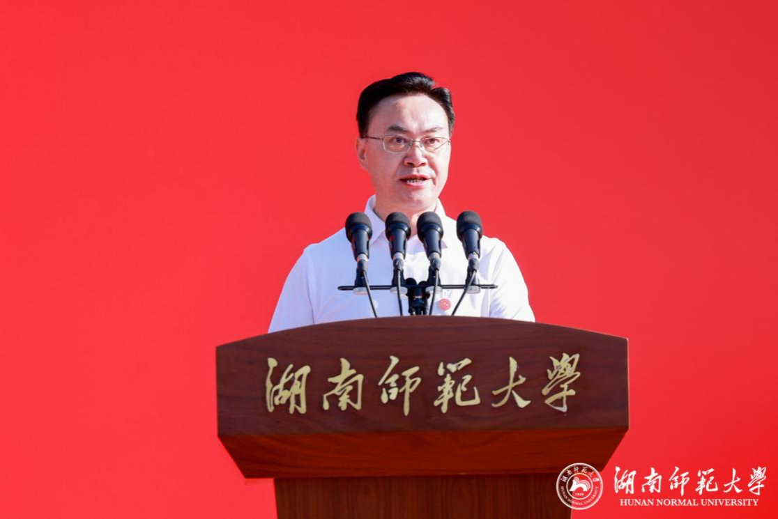 2025年湖南省最美教師、馬克思主義學院教授鄧驗作為教師代表發言。她回顧緣系師大的14年成長路,鼓勵同學們以理想為燈照亮前路、以創新為翼搏擊長空、以堅韌為盾直面挑戰、以團結為橋連接未來,奮力奔跑、勇敢逐夢,成長為有理想、敢擔當、能吃苦、肯奮斗的新時代好青年!