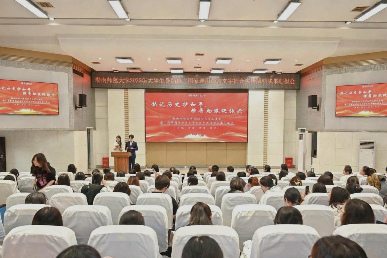 在成果匯報環節,優秀實踐團隊依次登臺,通過視頻展示、情景再現、數據呈現等多元形式,展示了暑期社會實踐成果。今年暑期,各團隊深入湖南多地鄉鎮,通過推普教學、語言調研與直播助農服務鄉村振興,并結合抗戰勝利80周年主題宣講紅色文化,充分展現了青年學子服務基層、以言賦能的使命擔當。