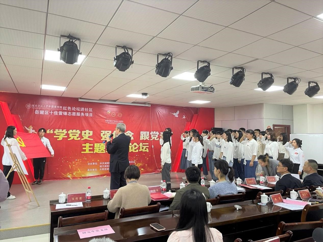 桔子洲街道黨工委組織委員、學堂坡社區黨總支第一書記王菁,湖南師范大學外國語學院黨委副書記賀慧星,學堂坡社區黨員代表,學院研究生、本科生黨員,團校“青馬工程”學員等150余人參加論壇。