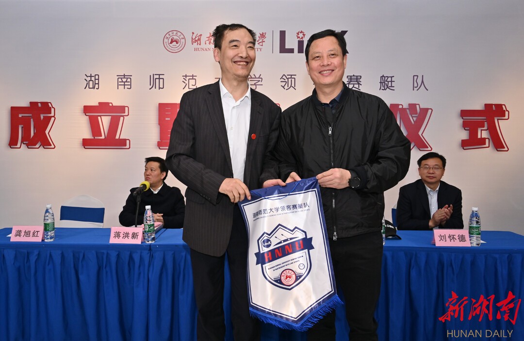 儀式現場,龔旭紅將隊旗授予湖南師范大學體育學院院長湯長發,湖南師范大學副校長劉懷德為賽艇隊的教練團隊頒發聘書,舉重奧運冠軍龍清泉被聘為“榮譽舵手”。