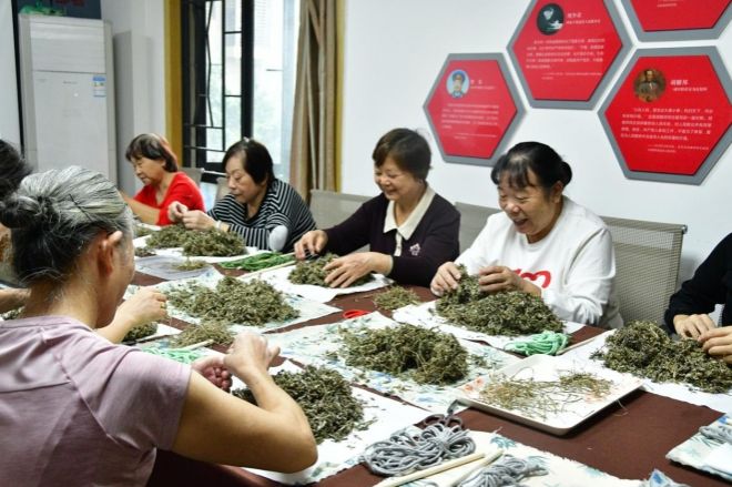 活動正式開始前,師大志愿者陳孜曦介紹了艾草養(yǎng)生錘的作用及制作流程,指出其融合了傳統(tǒng)香包與按摩工具的功能,以及發(fā)揮艾草特有的溫經(jīng)散寒、驅(qū)蚊蟲等作用。正式制作環(huán)節(jié)中,社區(qū)老年居民們先將艾草中的雜質(zhì)和硬桿挑出,僅保留葉片和莖部。按壓艾草并使其更緊實后,他們在美愈家工作人員的指導(dǎo)下和湖師大志愿者的協(xié)助下用布料將木棍、艾草包裹起來。隨后,老年居民們用棉繩圍繞木棍進行捆綁與固定,防止艾草錘在使用的過程中脫落。社區(qū)居民周阿姨表示,在活動過程中她非常放松,她愿意繼續(xù)參與類似的活動,也希望社區(qū)可以舉辦更多手作活動。