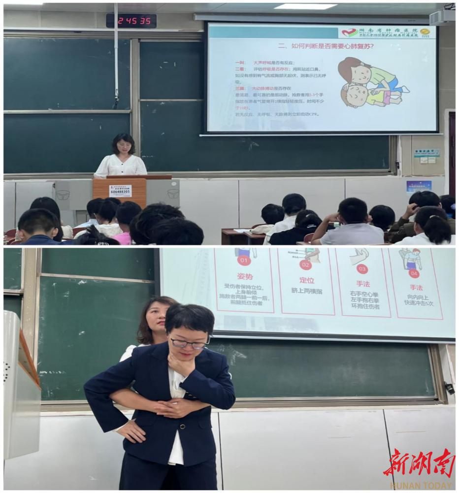 湖南省腫瘤醫院ICU護士長谷梅向同學們介紹了急救知識,并親自演繹急救的操作。心肺復蘇,是當心臟驟停時,重啟生命引擎的黃金鑰匙。海姆立克急救法,是食物卡喉時的救命稻草,簡單而有效。防溺水教育,則是夏日水域邊的安全燈塔,提醒我們在水中嬉戲時,不忘安全的重要性。通過急救公益宣講,我們希望將這些生命的守護知識,植入每個學子的心中,讓急救的智慧,成為我們共同的語言,共同構筑一道守護生命的防線。