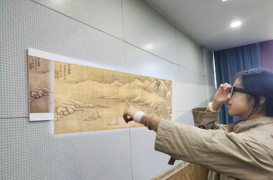 戴上AR眼鏡,目光投向明代畫家張龍章所繪的“瀟湘八景·江天暮雪”作品,孤舟、流云、飛雪等瞬間靈動,躍然于鏡片之上。伴隨鏡腿內置揚聲器中播放的中英文音頻講解,流傳千年的瀟湘八景圖在虛擬與現實的交互中多模態呈現開來。這是本學期湖南師范大學語言與文化研究院、外國語學院開設的“湖湘文化傳承傳播”課程基于數智技術進行的教學創新探索場景之一。