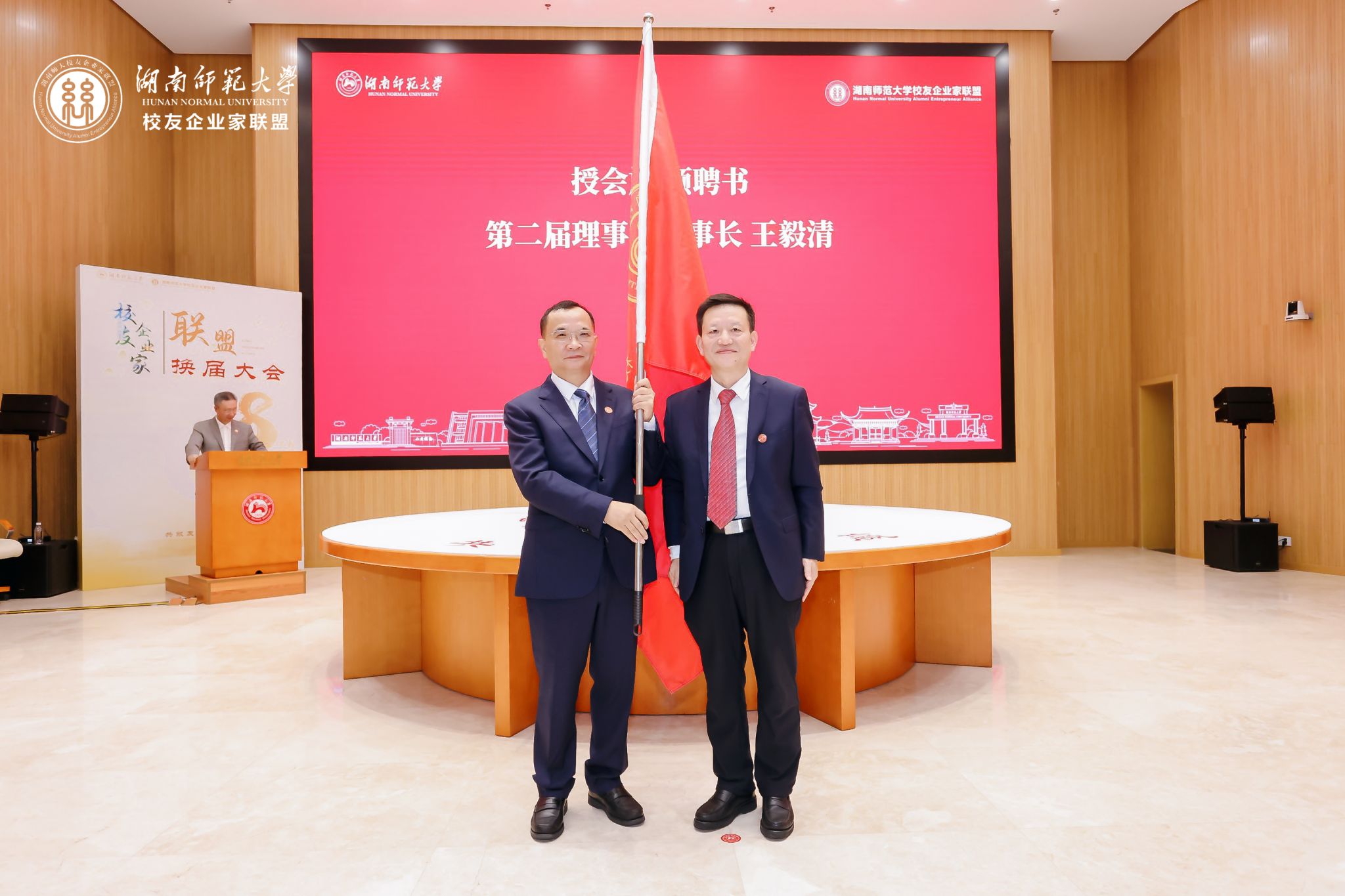 會(huì)議審議并通過(guò)了《湖南師范大學(xué)校友企業(yè)家聯(lián)盟章程》修訂案及湖南師范大學(xué)校友企業(yè)家聯(lián)盟第二屆理事會(huì)組織機(jī)構(gòu)名單,選舉產(chǎn)生了第二屆理事會(huì)成員。校黨委書記蔣洪新向當(dāng)選理事長(zhǎng)、該校85級(jí)校友、湖南達(dá)嘉維康醫(yī)藥有限公司董事長(zhǎng)王毅清授會(huì)旗并頒發(fā)聘書。隨后,他與校長(zhǎng)劉仲華共同為第二屆理事會(huì)成員頒發(fā)了聘書。