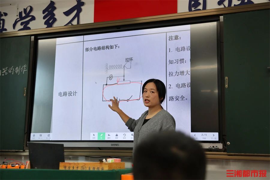 如何制作電子拉力器?教師劉靜雅以使用健身器材的主觀感受引入,提出常規(guī)健身器材存在的問(wèn)題,從而拋磚引玉引導(dǎo)學(xué)生一步一步設(shè)計(jì)并完善能均勻變化的電子拉力器的方案,劉靜雅還帶來(lái)了自制的改裝器材——由彈簧和滑動(dòng)變阻器改裝的簡(jiǎn)易電子拉力器裝置,設(shè)計(jì)精巧美觀,實(shí)驗(yàn)現(xiàn)象明顯,高效地完成預(yù)定實(shí)驗(yàn)?zāi)繕?biāo)。