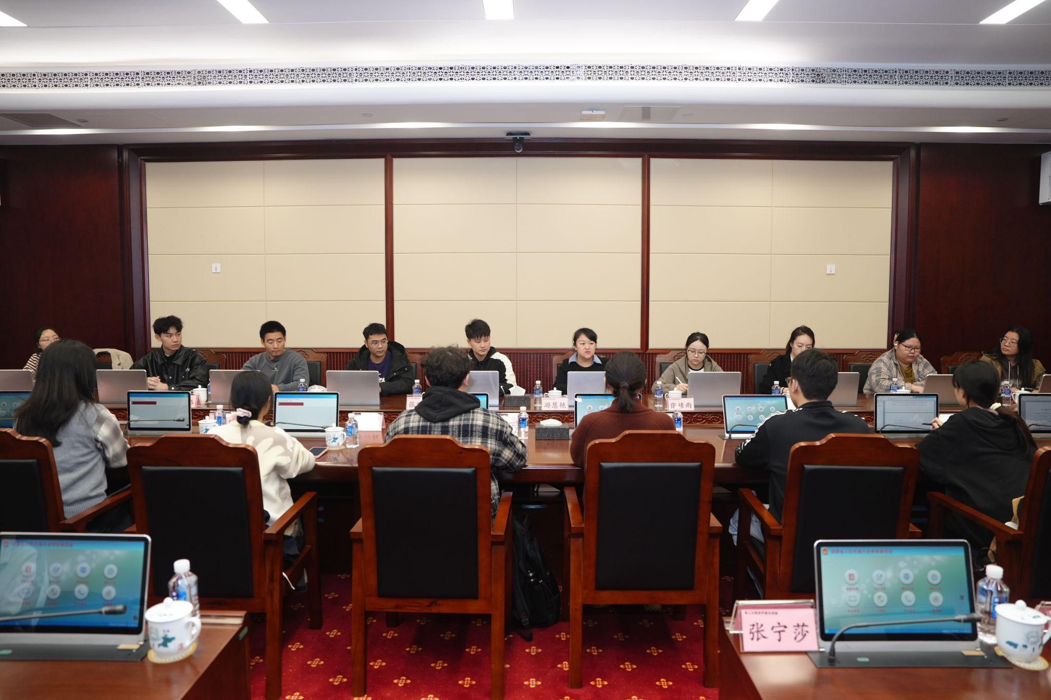 結束分組審議,同學們來到了常委會會議室,坐在印有自己名牌的座位上,紛紛拍照打卡留念。在這里,大家觀看了人大融媒體小課堂視頻,生動了解人大常委會會議的具體流程,隨后,同學們現場模擬了人大常委會會議表決流程和憲法宣誓。