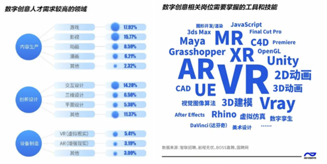當前,內容展示方式逐漸從傳統二維展示向三維交互方向演進,三維交互廣泛應用于游戲娛樂、商品/空間展示、教育教學、文旅文博交互體驗等領域。從南都大數據研究院采集的招聘崗位數據來看,數字創意人才中交互設計相關人才需求較高,占比約為14.28%。且調查結果顯示,內容生產、創新設計、設備制造等數字創意人才招聘崗位,普遍需要掌握AR、VR、XR、MR等技術,掌握三維交互內容制作技能成為增強就業競爭力的關鍵。