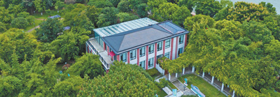喬木、灌木、竹林和草地,覆蓋了橘子洲的絕大部分面積。零星的建筑點綴其中,只從樹縫中露出屋頂。