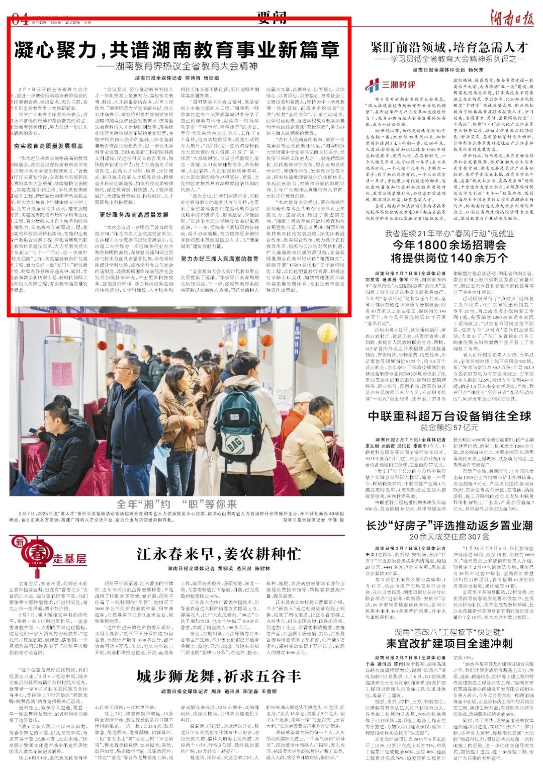 “作為近年來我省規格最高的教育領域盛會,此次會議在我省教育改革發展歷程中具有重要里程碑意義?!笔〗逃龔d廳長夏智倫說,全省教育系統將深入貫徹落實大會精神,繼續堅持立德樹人,實施黨建引領工程、學校思政課質量提升工程,持續做優湖南特色思政品牌。將大力實施青少年健康成長守護工程,扎實開展全員文體活動。錨定戰略需求,實施高等院校布局和學科專業優化工程,著力增強人才自主培養和服務支撐能力,實施高校創新驅動工程,推動高??萍汲晒D化落地。實施職業教育產教融合發展工程,深化省域現代職業教育體系建設改革。大力開展支持大學生創業“七個一”行動,進一步做好“校友回湘”工作。實施基礎教育擴優提質工程,著力辦好一批“家門口”新優質學校,持續辦好縣域普通高中。同時,實施教育數字化轉型工程、新時代強師工程和投入保障工程,夯實教育高質量發展根基。