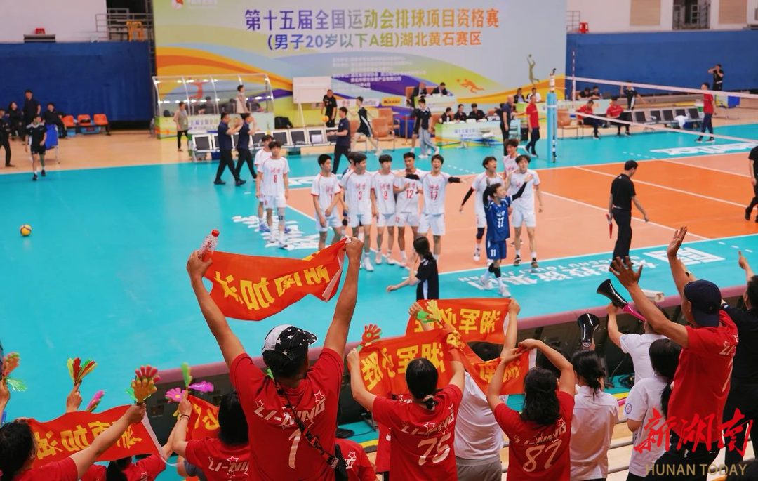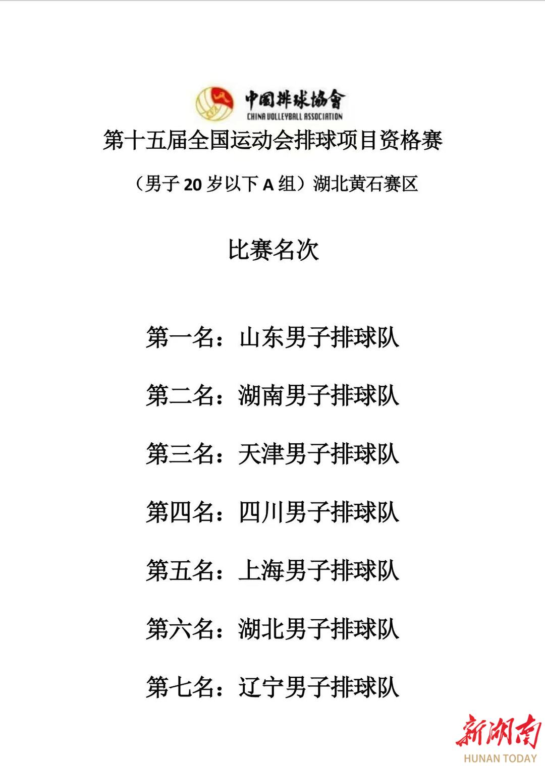 湖南日報·新湖南客戶端4月26日訊(記者 蔡矜宜)4月25日下午,在第十五屆全國運動會排球項目資格賽(男子20歲以下組)湖北黃石賽區的一場焦點大戰中,身著白色球衣的湖南U20男排3比0戰勝天津隊,從而鎖定賽區前五名,湖南青年男排歷史首次闖入全運會決賽階段!