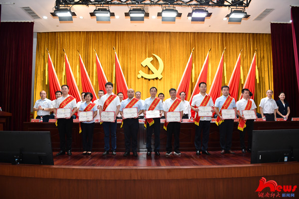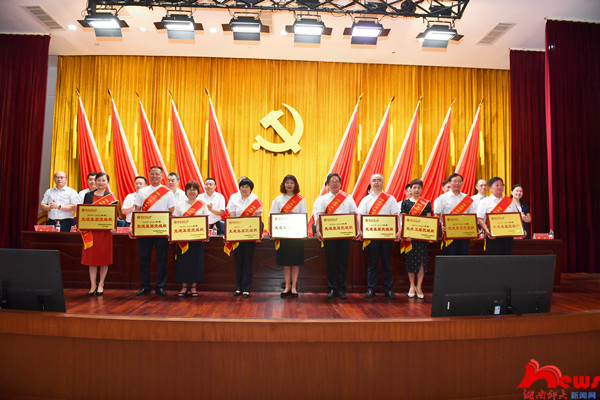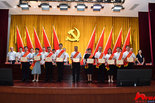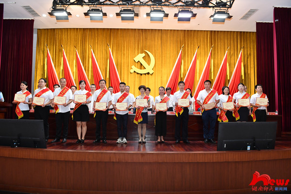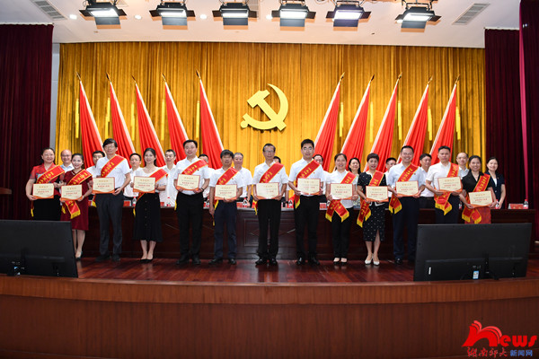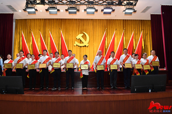 校紀委書記姚春梅宣讀2019年以來學校省級以上黨建榮譽獲得者名單。全國先進基層黨組織教育科學學院黨委,湖南省優秀共產黨員肖北庚,以及一批入選省級“對標爭先”建設計劃的集體和個人等受到表彰。