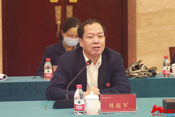 座談會(huì)上,劉起軍對(duì)謝衛(wèi)江一行來(lái)校調(diào)研表示熱烈歡迎,對(duì)省委、省政府對(duì)學(xué)校的關(guān)心支持表示衷心感謝。他介紹了學(xué)校成立歷史淵源、發(fā)展規(guī)模、現(xiàn)階段影響力等基本情況,從人才培養(yǎng)質(zhì)量、科學(xué)研究成果、服務(wù)發(fā)展能力、黨建思政工作等方面展示了我校近年來(lái)取得的豐碩成果,并闡述了我校未來(lái)的發(fā)展規(guī)劃。他表示,學(xué)校將進(jìn)一步堅(jiān)持立德樹(shù)人的根本任務(wù),深入推進(jìn)“雙一流”建設(shè),更好地服務(wù)湖南省“三高四新”戰(zhàn)略和現(xiàn)代化新湖南建設(shè)。