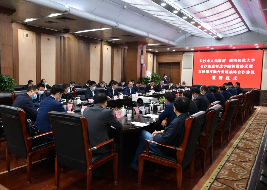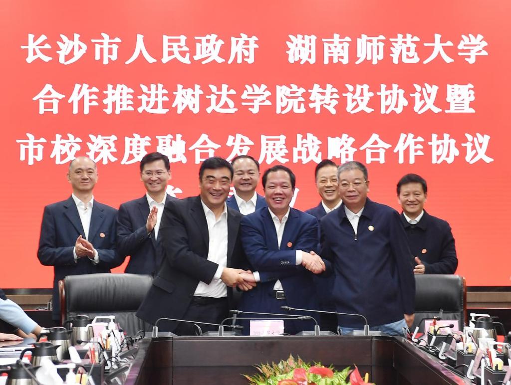 劉起軍、劉明理、周俊武代表三方簽署《湖南師范大學長沙市人民政府 湖南師范大學樹達學院推進湖南師范大學樹達學院轉設工作合作協議》;劉起軍、劉明理代表雙方簽署《長沙市人民政府湖南師范大學市校深度融合發展戰略合作協議》。