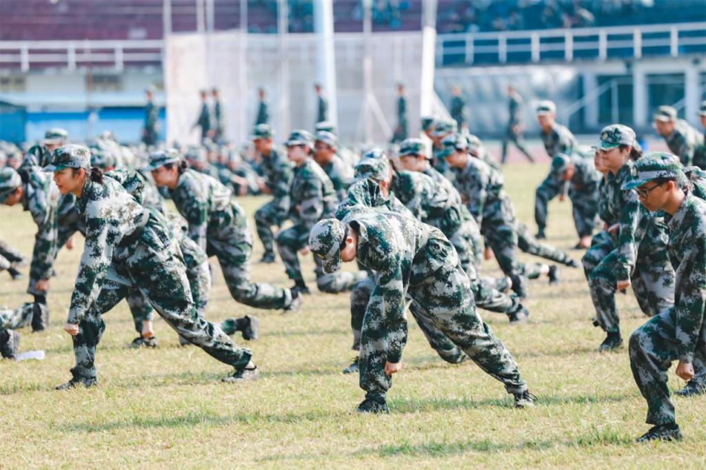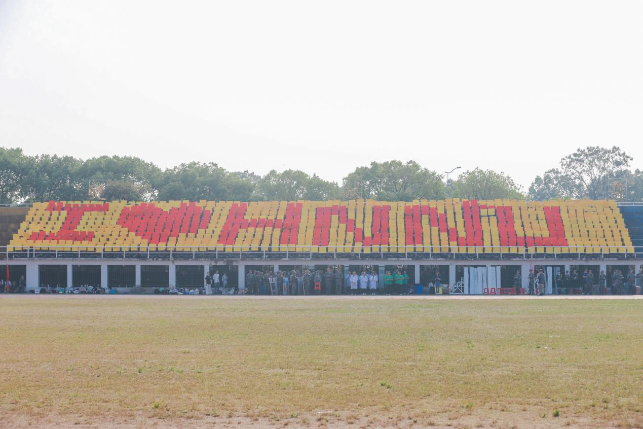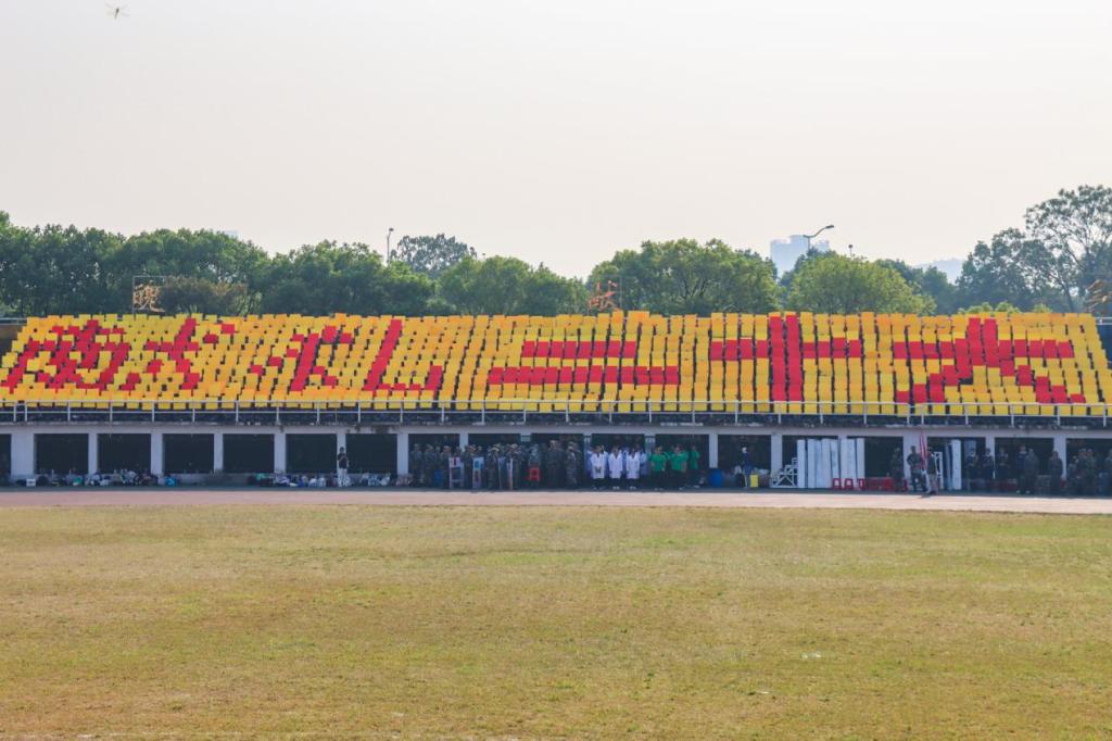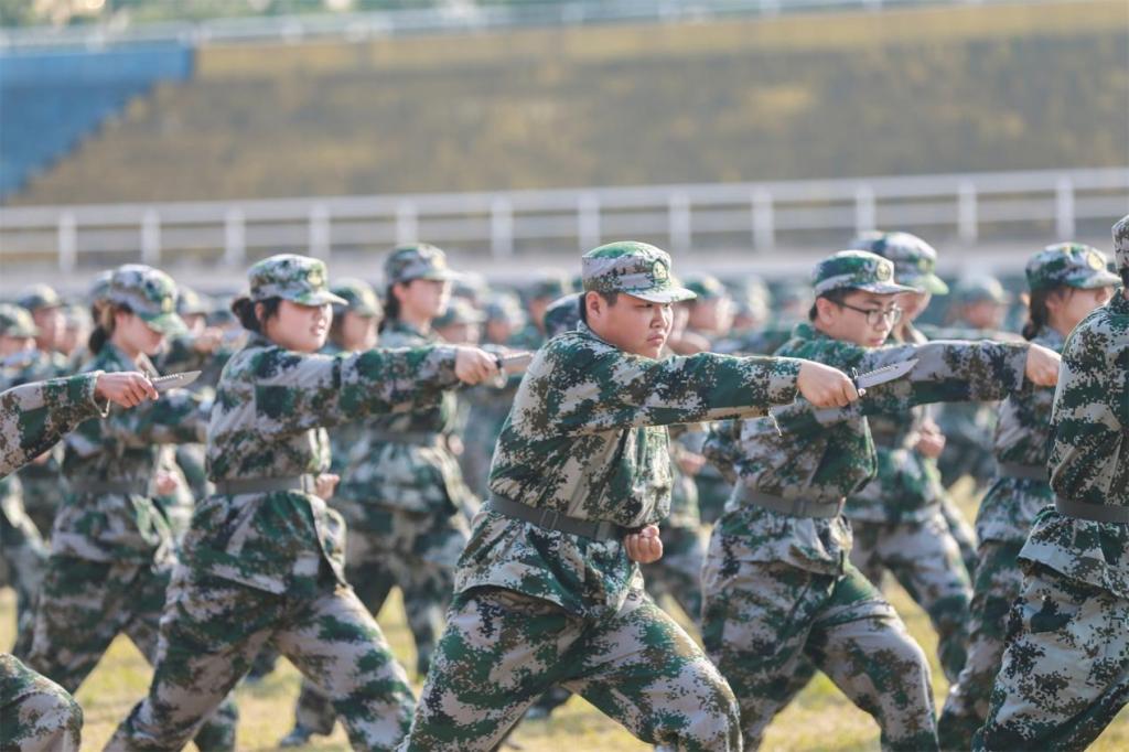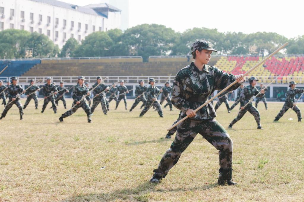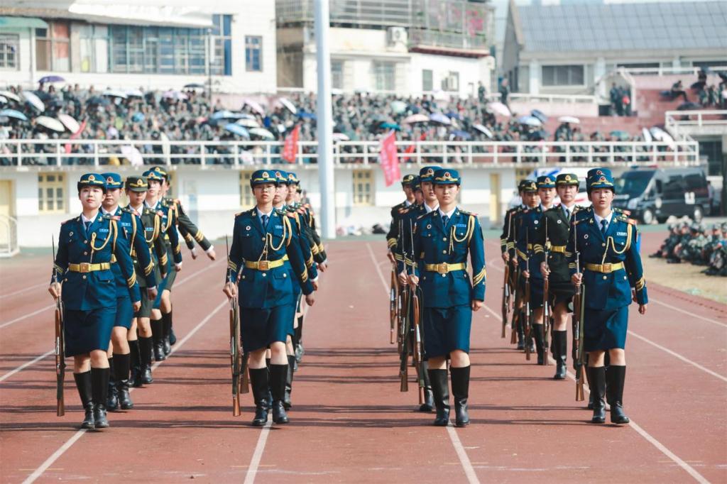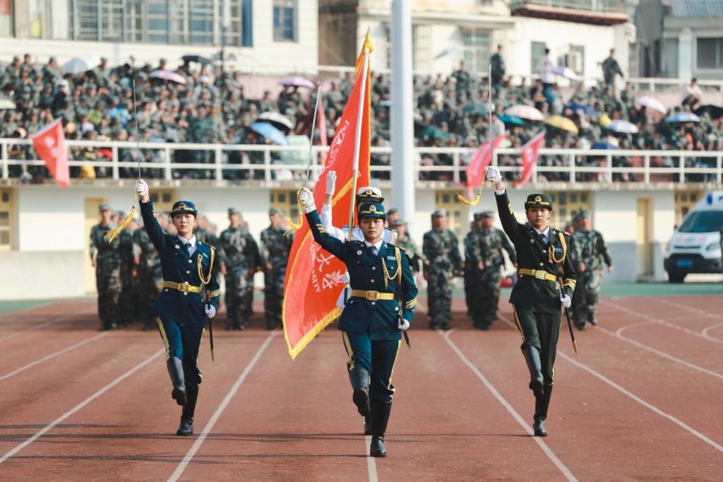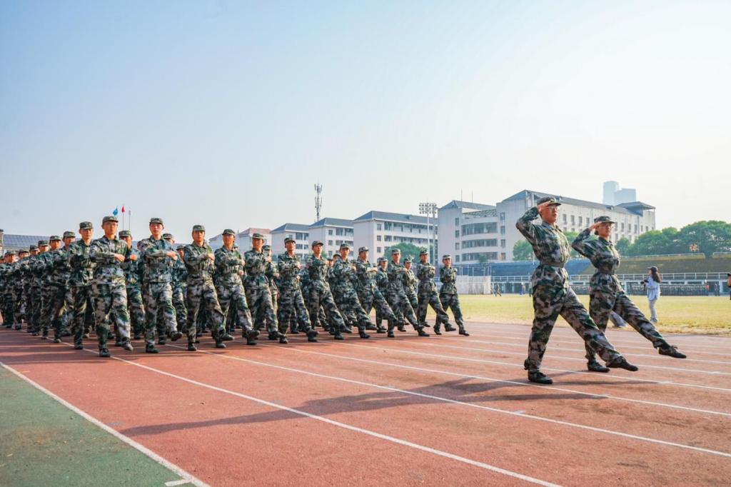 軍訓成果匯報儀式由女子國旗護衛隊教導員呂汶芯指揮。隨著分列式進行曲響起,標兵就位,各學院方陣邁著堅定的步伐,喊著嘹亮的口號,依次踏正步走過主席臺前接受檢閱。