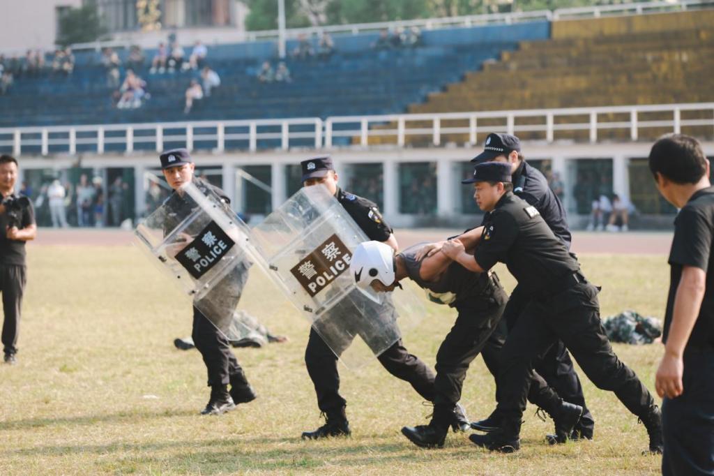保衛處開展反恐防爆演練,提醒學生提高反恐防暴意識。