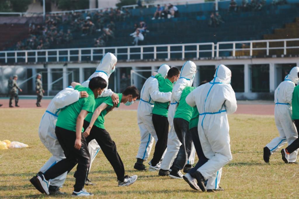 生命科學學院、化學化工學院帶來核生化防護演練表演,警示同學們銘記歷史、珍愛和平。