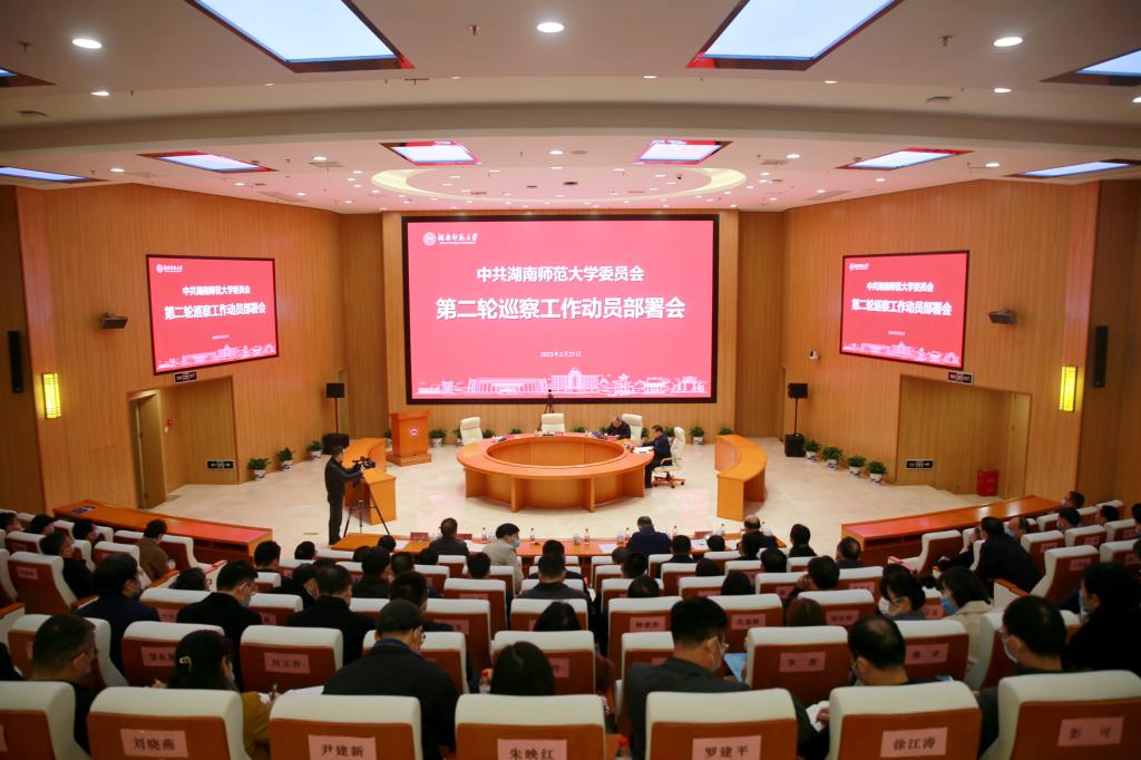 校黨委副書記周俊武宣讀了《中共湖南師范大學委員會第二輪巡察授權及任務分工決定》。他對巡察工作提出三點要求:一是深化思想認識,把思想和行動統一到黨的二十大精神上來;二是堅守職能定位,推進政治監督具體化、精準化、常態化;三是增強行動自覺,把巡察工作高質量發展持續引向深入。他強調,要深入學習貫徹黨的二十大精神和習近平總書記在二十屆中央紀委二次全會上發表重要講話精神,貫徹落實中央和省委關于巡視巡察工作的新部署新要求,以高質量校內巡察工作,護航學校事業高質量發展。