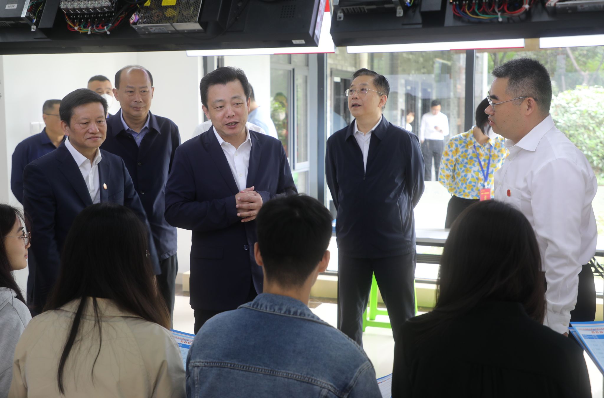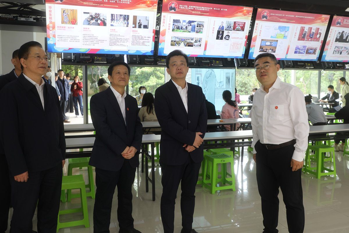 秦國文一行首先參觀了我校學生職業發展中心,詳細了解了我校的招生就業、人才培養、產學研結合、校企合作等方面的情況。期間,秦國文深切關注大學生的就業問題,并熱情地與中心指導老師、招聘單位工作人員、大學生交流互動,詢問當前的大學生就業情況及普遍存在的急難愁盼問題。他指出,學校要做好鼓勵引導畢業生到基層、到企業就業創業,積極融入岳麓山大學科技城建設和湘江新區創新發展。省政府將積極支持學校大學生就業工作,共同解決學生在創業就業中遇到的困難。