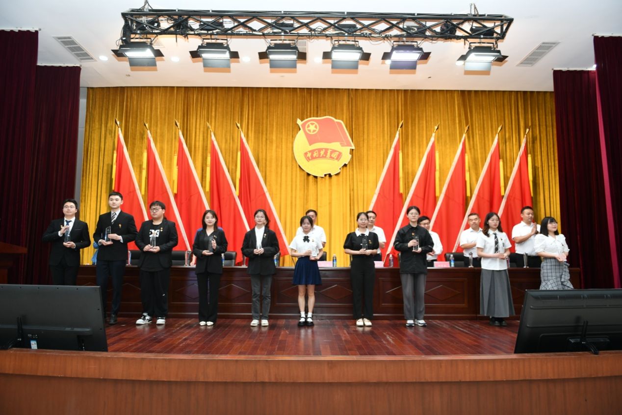 主席臺就座嘉賓分別為獲獎先進團體及優秀個人頒獎。“十佳共青團先進工作者”歷史文化學院團委書記陳卓君、“芙蓉學子社會實踐獎”旅游學院“云聚童心·鄉繪曦望”志愿服務團隊作代表發言。