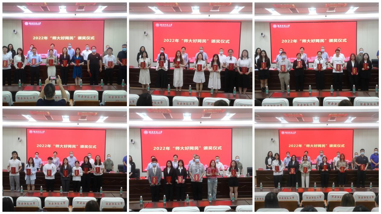 周俊武等參會領導為2022年度“師大好網民”獲獎師生頒獎并合影留念。