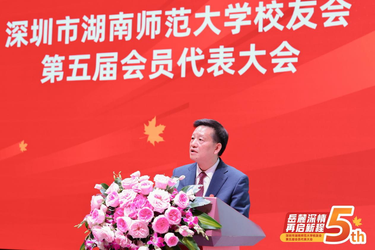 蔣洪新在代表大會上發(fā)表講話。他對深圳校友會第五屆會員大會的順利召開表示祝賀,向與會嘉賓表示熱烈歡迎和親切問候。他簡要介紹了學(xué)校近年來在學(xué)科建設(shè)、人才引進、基礎(chǔ)設(shè)施建設(shè)方面取得的成績,強調(diào)了集合校友、政府、社會等各方力量,構(gòu)建命運發(fā)展共同體的重要性。蔣洪新希望,深圳校友會能以“共敘同窗友情,傳播師大品牌,整合校友資源,服務(wù)深圳建設(shè)”為宗旨,成為校友們傳遞母校情感的重要載體、互促共進的發(fā)展平臺、聯(lián)絡(luò)感情的精神家園。最后,他即興填詞《賀新郎·為深圳校友會第五屆會員大會而作》,表達(dá)謝忱、以示激勵。
