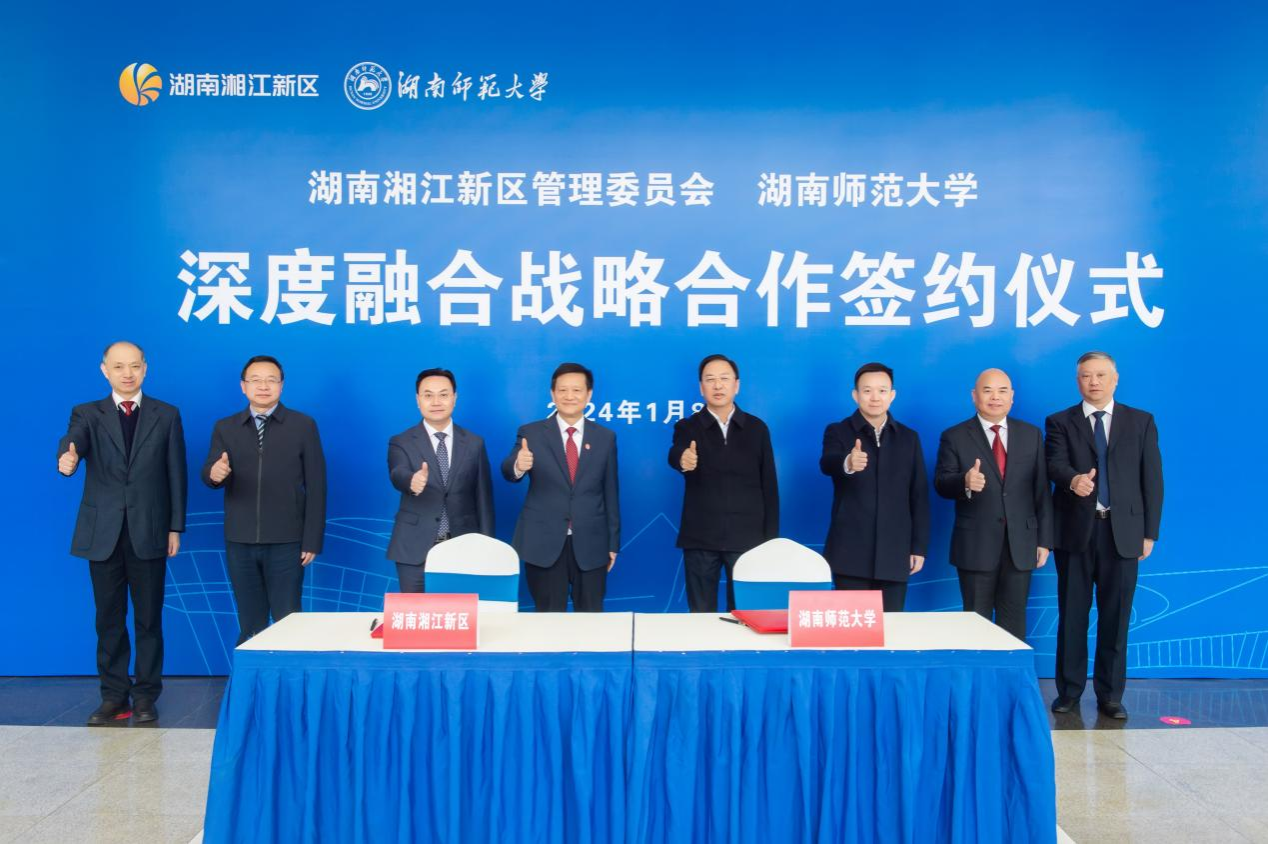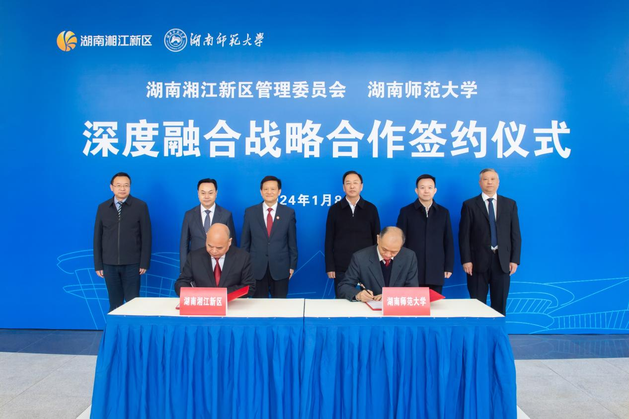 湖南湘江新區(長沙高新區)黨工委委員、管委會副主任郭力夫和楊震,代表雙方簽署《湖南湘江新區管理委員會湖南師范大學深度融合戰略合作框架協議》。