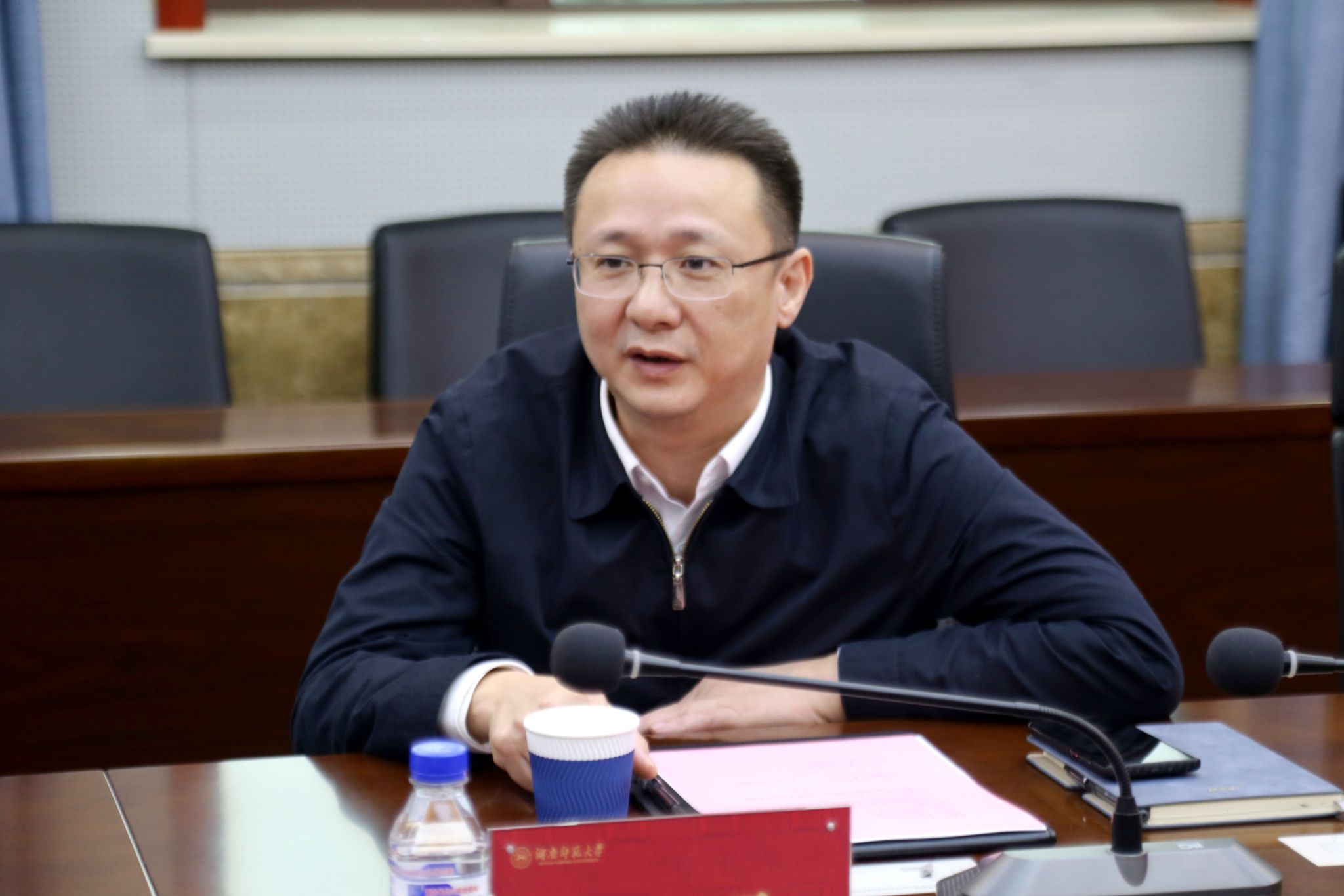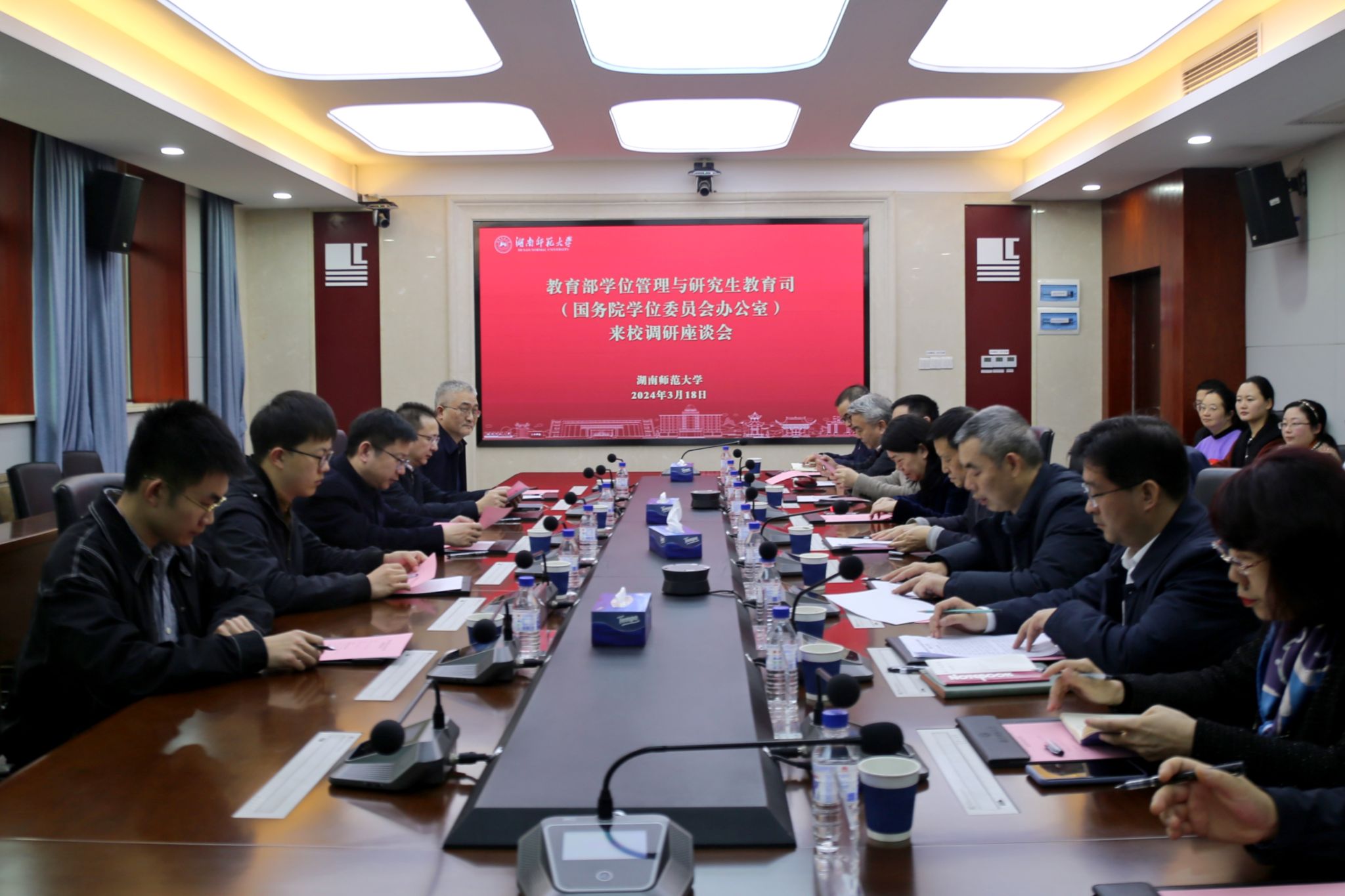 教育部學(xué)位管理與研究生教育司學(xué)位管理處干部陳傲寒、張萬龍,湖南省教育廳學(xué)位管理與研究生教育處處長顏勝利,學(xué)校相關(guān)職能部門及二級學(xué)院負(fù)責(zé)人陪同調(diào)研并參加座談會。