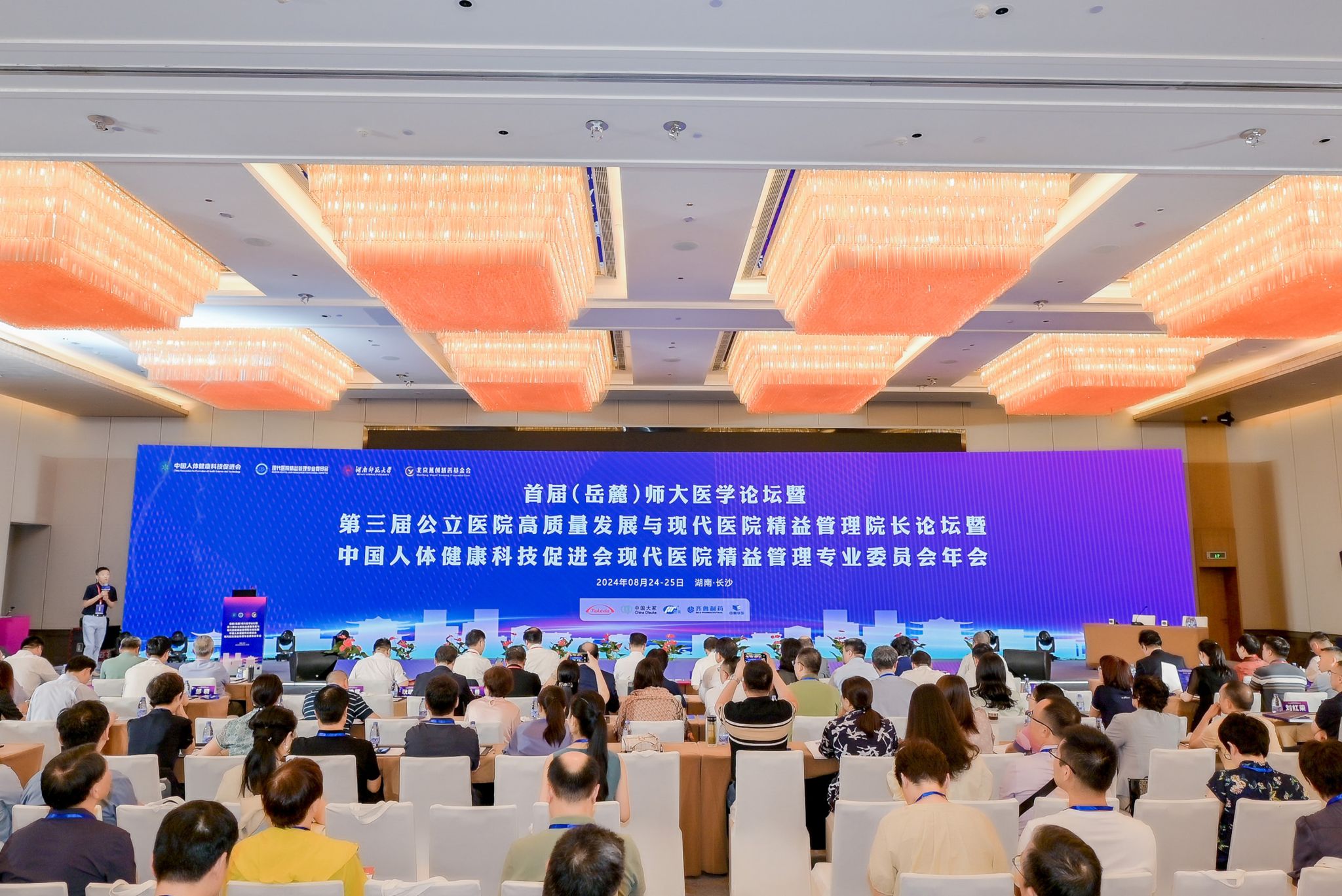 中華醫(yī)學(xué)會副會長、北京醫(yī)學(xué)會會長封國生,國家中醫(yī)藥管理局醫(yī)政司原司長蔣健,湖南省衛(wèi)健委黨組成員、副主任程博,中國人體健康科技促進(jìn)會黨支部書記、秘書長夏芩燦,中國人體健康科技促進(jìn)會現(xiàn)代醫(yī)院精益管理專業(yè)委員會主委趙越、副主任委員兼秘書長楊有業(yè)教授,北京燕創(chuàng)慈善基金會發(fā)起人、副理事長朱婧,我校黨委書記、歐洲科學(xué)院院士蔣洪新,校長、中共第二十屆中央候補(bǔ)委員、中國工程院院士劉仲華,黨委副書記周俊武,副校長謝資清,醫(yī)學(xué)部主任、湖南省衛(wèi)生健康委原副主任祝益民,原常務(wù)副校長盧岳華,附屬第一醫(yī)院(湖南省人民醫(yī)院)黨委書記趙衛(wèi)華、院長肖亞洲出席活動。大會由劉仲華和楊有業(yè)共同擔(dān)任開幕式主持嘉賓。