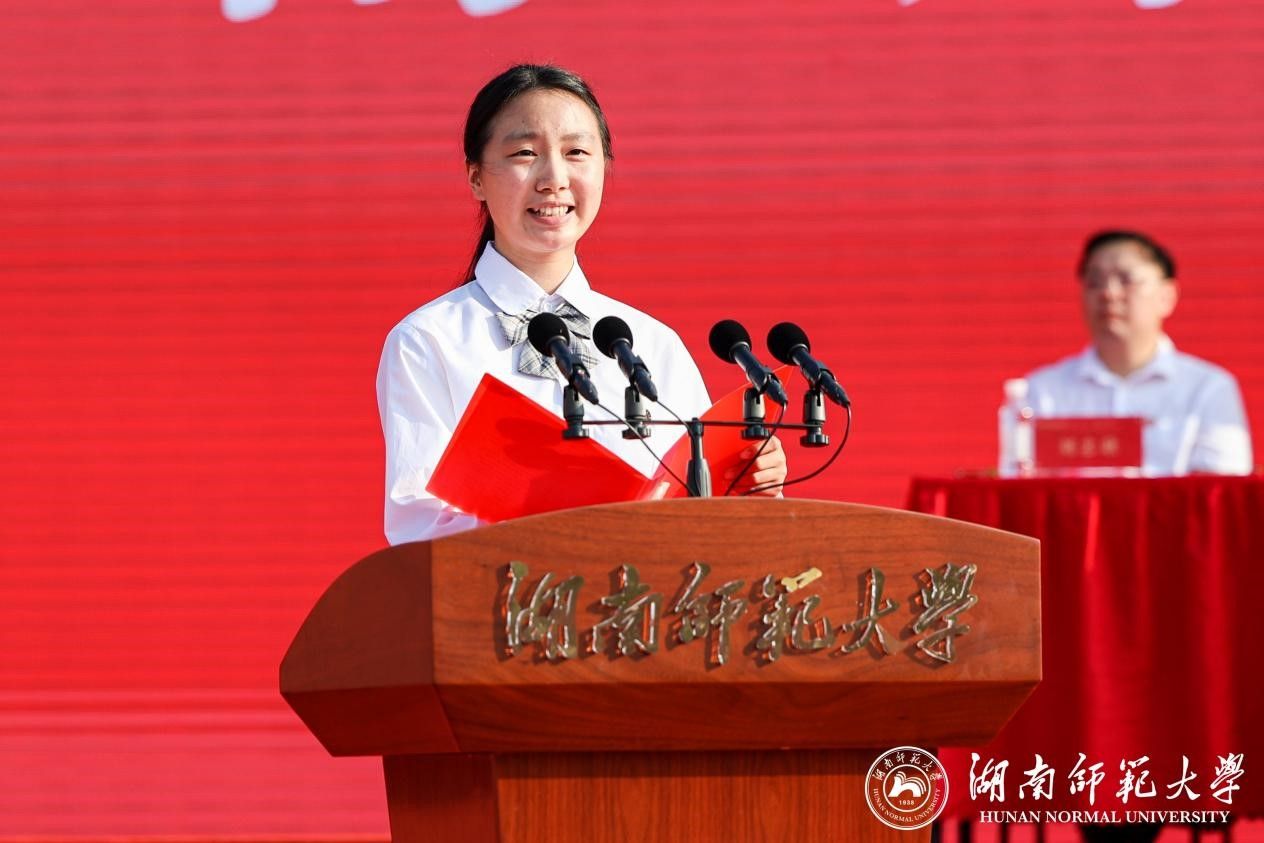 著名兒童文學作家、湖南省作協主席、文學院教授湯素蘭作為教師代表發言。她鼓勵同學們抓住確立價值觀、規劃未來的關鍵時期,為學求真、為事向善、為人尚美,在價值觀多元的時代,堅持做真誠的人,在求學路上勇于求真知、努力探真理。