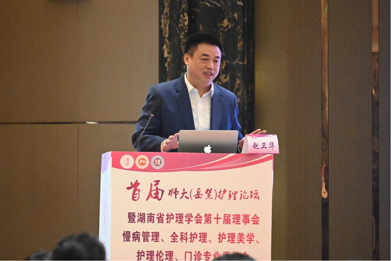趙衛華對各位領導、嘉賓、專家學者的到來表示熱烈的歡迎和誠摯的感謝。他指出,護理作為醫療衛生事業的重要組成部分,在醫療保健體系中扮演著重要的角色。護理人才培養對個人、醫療系統、社會乃至國家的發展都有著深遠的影響。護理學院的成立是我校在醫學教育領域的重要里程碑,為推動健康中國、健康湖南貢獻了智慧和力量。