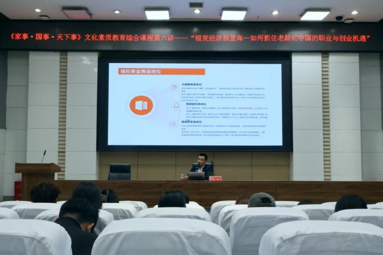 龍攀以“銀發經濟新藍海——如何抓住老齡化中國的職業與創業機遇”為主題,深度剖析了大學生投身老年護理、智能養老產品生產等創業領域的可行路徑。他強調,銀發經濟不是簡單的“照顧經濟”,而是涵蓋了醫療科技、文化娛樂、金融創新的復合生態系統。他指出,在人口結構深度調整的背景下,“適老化產品創新”“智慧康養服務”“銀發人力資源開發”的大賽道正迸發強大的產業勢能,同學們需以創新思維驅動實踐,打造差異化創業策略,既為老年群體構筑高品質生活,也為自身開拓職業新賽道,在銀發經濟藍海中實現商業與社會價值的雙向奔赴。在講座的最后,龍攀與師生進行了互動問答,現場氣氛熱烈。